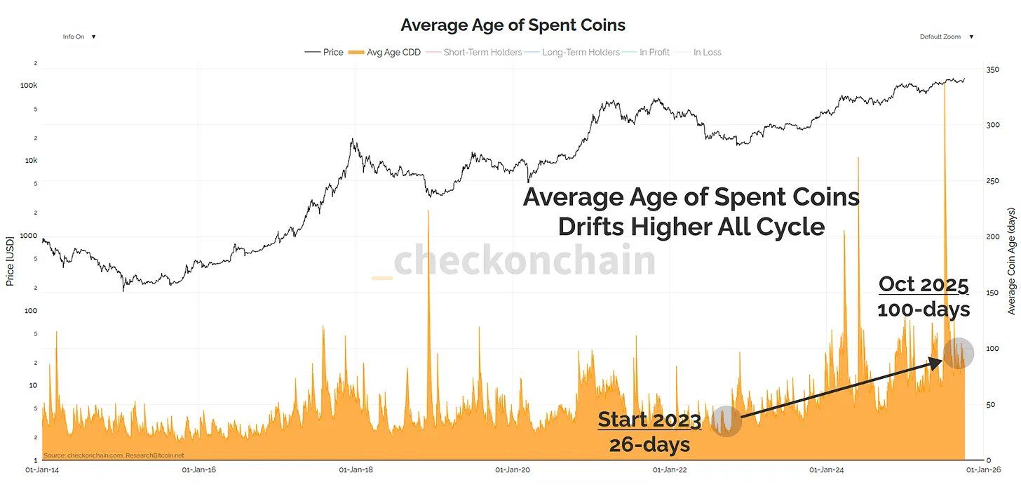 Приложение B: Средний возраст потраченных монет, история о благородном старении. С 26 дней в 2023 году до 100 дней сейчас – старше лжи Тартюфа! 🕯️