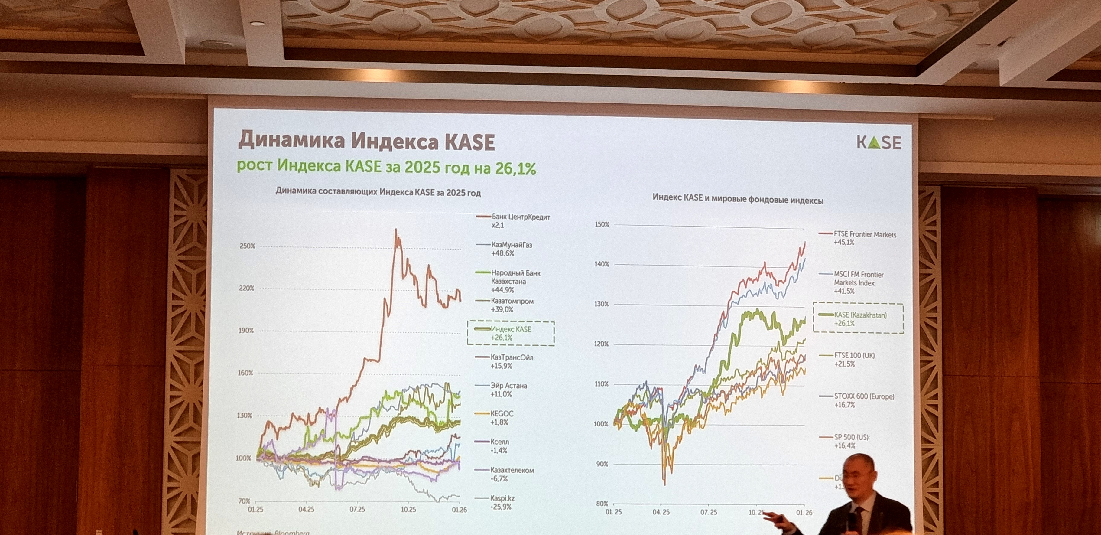 Особо следует отметить динамику фондового рынка. Рыночная капитализация увеличилась на 19%, достигнув 39 триллионов тенге (79 миллиардов долларов США), в то время как индекс KASE вырос на 26,1% за год. Среднедневной объем торгов акциями достиг 1,2 миллиарда тенге (2,4 миллиона долларов США), при среднем количестве 11 399 сделок в день.